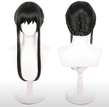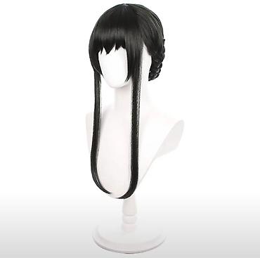 Qara cosplay parik Spy x family– ön perçemli, iki uzun yan tutamlı, arxa hissəsi hörüklü