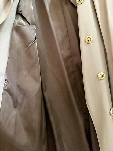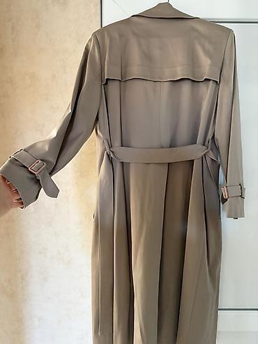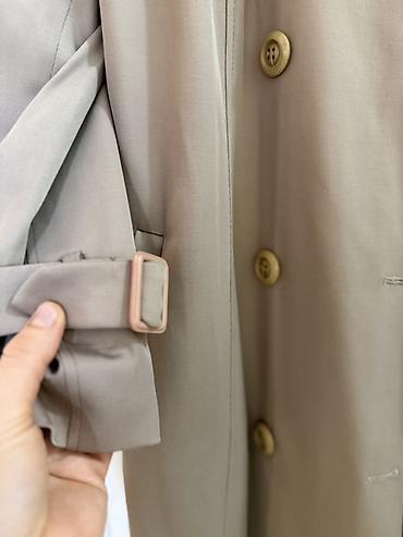 Plaş tezedi 48 razmer - Rəng: tünd göy, kontrast açıq bej detal və kəmər - Model: geniş V formalı üst yaxalıq, düyməli ön hissə - Kəmər: çıxarılan, eyni bej rəngdə - Uzunluq: orta (dizə yaxın) - Q...