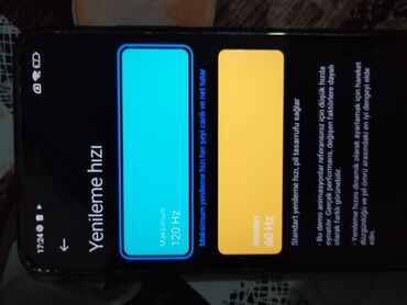 - Ekran parametrləri menyusunda dinamik yeniləmə sürəti seçimi, batareya qənaəti üçün standart 60 Hz rejimi barədə izah mövcuddur.