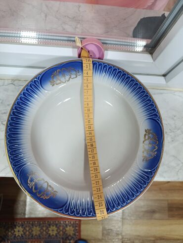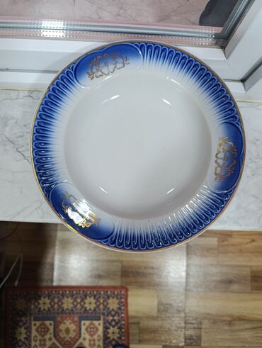 Porselen desert boşqabı - Material: nazik porselen - Rəng və bəzək: tünd göy kənar, qızılı haşiyə və ornamentlər; mərkəzdə qızılı çiçək kompozisiyası - Üslub: klassik, zərif dekorativ naxışlarla -...