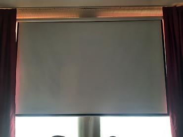 - Proyeksiya ekranı: pərdəyə bənzər rulon tipli ekran (şəkildə göstərilib), yuxarıdan asılan konstruksiya