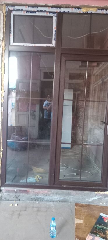 - Konstruksiya: bir sürgülü qapı qanadı + yan vitraj bölmə; yuxarı hissədə dar transom/pəncərə hissəsi