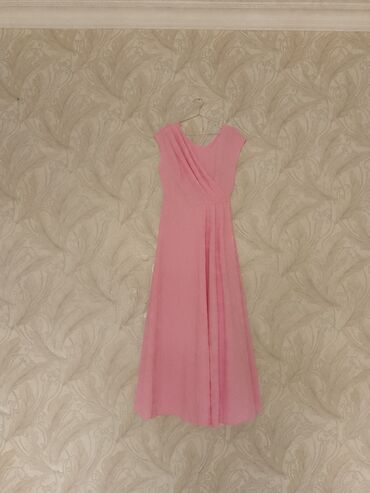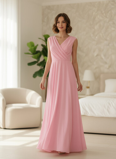 MidiZərif pudra-çəhrayı rəngli qadın donu. Asimmetrik büzgülü üst hissə və V-yaxalı kəsim silueti incə göstərir. Çiyinlərdə qapaqvari qısa hissələr, beldən aşağıya doğru açılan A-kəsim ətək rahat hərəkət imkanı yaradır. Orta uzunluq – baldırın ortasına qədər. Parça axıcı və yüngüldür, qatlanmış ön panel ətəyə dinamika verir. Günlük geyimdən tutmuş tədbir və məclislərə qədər uyğun, minimalist və eleqant dizayn. Rəng sabit, tekstura hamar, astarsız görünür. Askı daxil deyil.