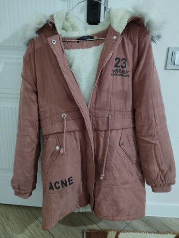 Çəhrayı rəngdə, içi xəzli, kapüşonlu qadın parka jaket. Bu jaket soyuq havalar üçün uyğundur və rahat istifadə təklif edir. Fermuar bağlaması ilə geyinib-soyunmaq asandır. 'ACNE' markası və '23 MAX PERFORMANCE' detalları jaketə müasir bir görünüş verir. Gündəlik geyim üçün əla seçimdir.