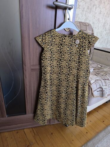 Qadın geyimləri – 2 don 1) Brend: Dojery (etiketdə 36 ölçü) - Rəng: qara fon üzərində qızılı-krem abstrakt naxışlar - Model: uzunqol, V-yaxa, bel hissəsi büzgülü və dekorativ lentlərlə vurğulanıb ...
