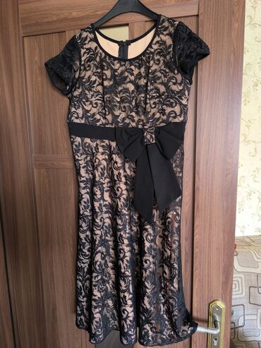Qadın geyimi – krujeva işli ziyafət paltarı - Rəng: tünd boz/şist - Brend: Coopé (etiketdə göstərilir) - Dizayn: güllü krujeva üst qat, incə parıltılı bəzək daşları və muncuq aplikasiyası - Yaxa: ...