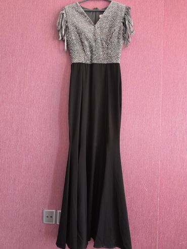 - Üst hissə: sıx parıltılı (payet görünüşlü), V-yaxa, çiyinlərdə sallantılı şerit dekoru