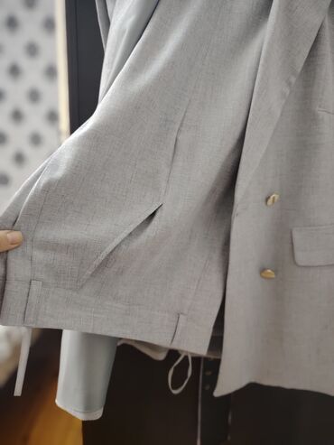 - Üst: dizayner jileti, V yaxalı və geniş dəstli döşlüklə; qızılı rəngli ikiqat düymələmə; yuxarı hissədə büzgülü/qatlı çiyin detalları; iki ədəd qapaqlı ön cib