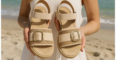 - Bej rəngli rahat sandal: iki enli ön zolaq üzərində iri qızılı toka detalları, elastik arxa kəmər, yumşaq yastıqlı içlik və teksturalı altlıq. Günlük və sahil tərzi kombinlərə uyğun neytral ton.25 azn