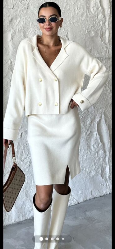 - İki hissəli krem rəngli dəst: qısa kəsimli, ikicərgə qızılı düyməli jaket və dizə qədər ətək. Jaket geniş yaxalı, iri manjetli; ətəkdə yüngül yan yarıq detalı var. Yumşaq, toxuma effekti verən parça, minimalist siluet, monoxrom görünüş üçün ideal. 35 azn