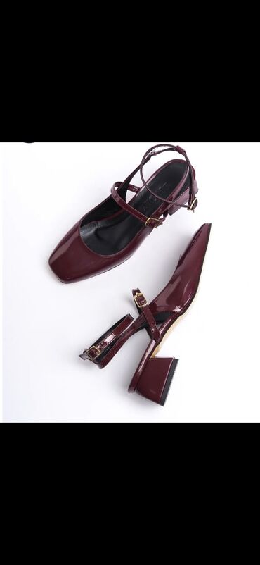 - Bordo rəngli lak dəridən açıq arxalı ayaqqabı: kvadrat burun, sabit enli orta hündürlükdə topuq, ikili kəmər və qızılı tokalar. İçi yumşaq astarlı, altlığı sürüşməyə davamlıdır. 30 azn