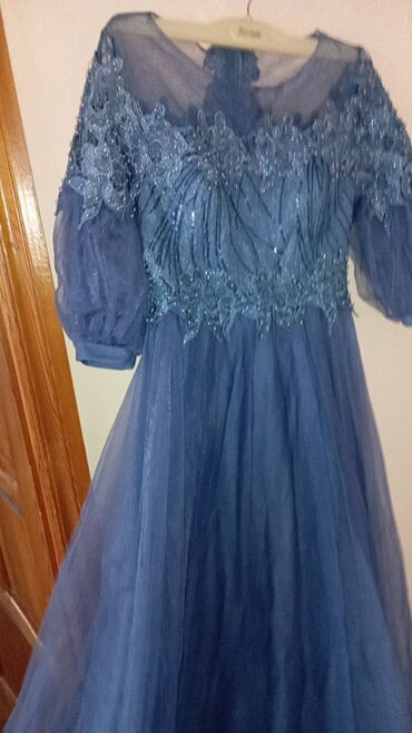 Tünd mavı rəngdə ziyafət geyimi. razmeri 44-46 - Üst hissə: parlaq payetlərlə bəzədilmiş, qismən şəffaf tül materialdan hazırlanmış pelerin tipli üst. Geniş, rahat düşümlü qollar və çiyinlərdən a...