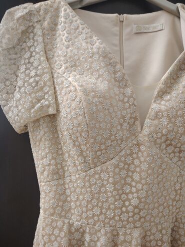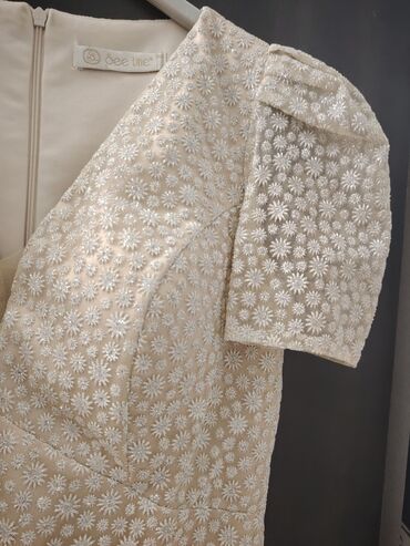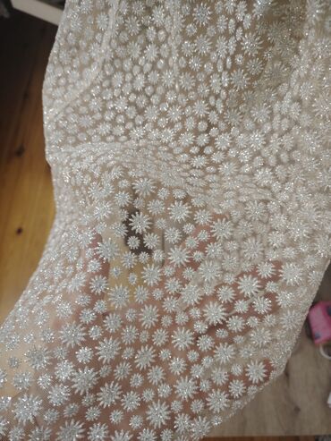 - Material: astarlı əsas parça, üzərində şəffaf tül tor və sıx güllü (uşağı xatırladan ulduz-çiçək) naxışlı aplikasiya