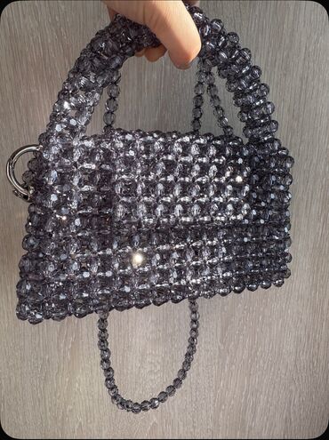 Şəffaf muncuqlardan əl ilə toxunmuş çanta - Material: parlaq, işıqda rənglərə çalan şəffaf akril muncuqlar - Dizayn: üst hissədə saplı miniatür “top-handle”, ön hissədə qızılı rəngli incə zəncir v...