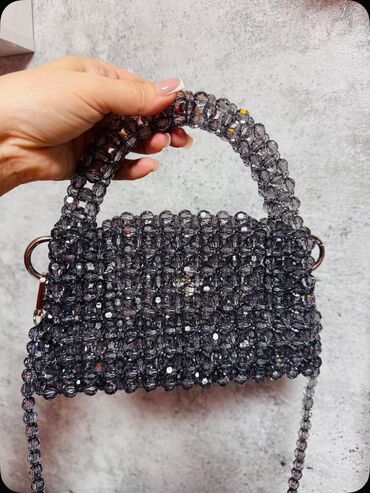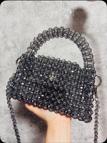Şəffaf bəzək daşlarından əl ilə hörülmüş qadın çantası - Material: Yüksək parıltılı şəffaf akril/kristal muncuqlar, möhkəm balıqçı teli ilə hörgü - Dizayn: Tamamilə muncuqdan ibarət korpus və qövs...