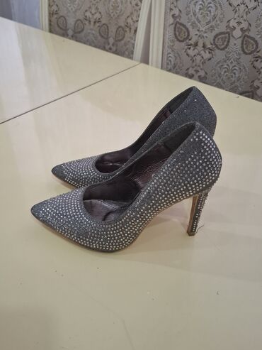 - Tufli: Boz-metal rəngdə, nazik burunlu və dikdaban model. Üzəri xırda parıldayan daşlarla tam örtülüb, daban hissəsində də daş işləməsi var. Klassik elegant siluet, donla gözəl kombin yaradır.