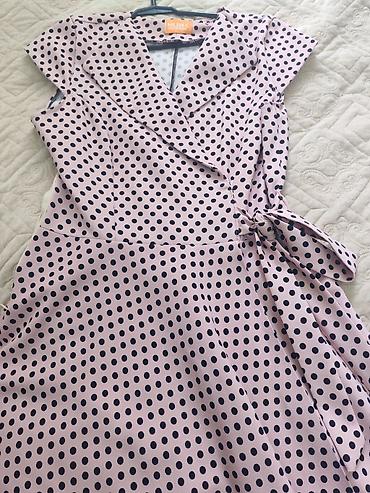 Xüsusiyyətlər: - Model: Zərif “wrap” kəsimli qadın donu - Rəng/naxış: Açıq çəhrayı fon üzərində xırda qara xallı (polka-dot) - Yaxa: V formalı qatlana bilən üst hissə - Qol: Qısa qollar - Bel: İp-k...