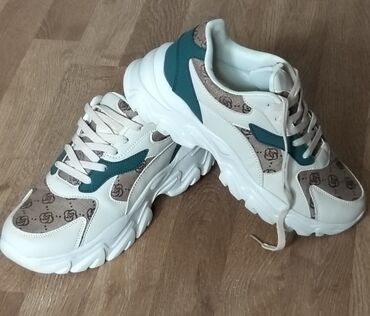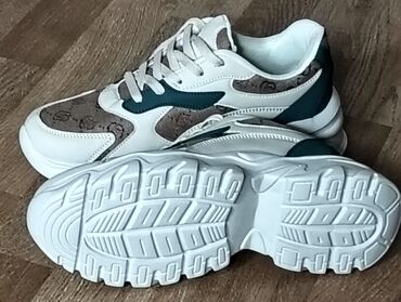 Ağ rəng üstünlükdə olan qalın tabanlı idman ayaqqabısı. Üst hissə süni dəri və bej rəngli naxışlı tekstil panellərin kombinasiyasından hazırlanıb; yanlarda tünd yaşıl dekorativ detallar var. Klassik bağlama sistemi. Yumşaq içlik və yastıqlı boğaz rahatlıq verir. Kütləvi, amortizasiyalı qabartmalı altlıq sürüşməyə qarşı protektorla təchiz edilib. Gündəlik geyim və gəzinti üçün uyğundur. Rənglər: ağ, bej naxışlı, tünd yaşıl vurğular. Şəkillərdə altlığın protektor nümunəsi və detallı görünüş təqdim olunub. Кроссовки женские осенне зимний период.Новые,качественные.размер не подошёл, на 40 размер.