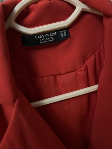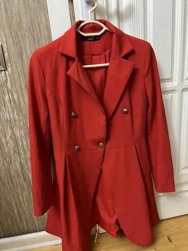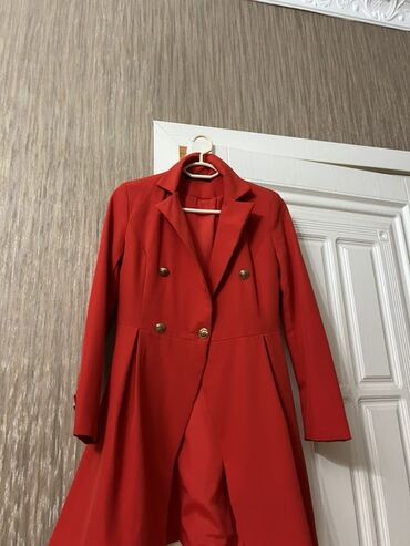 Zərif siluet yaradan, diqqətçəkən qırmızı ton və qızılı düymələr ilə elegant görünüş təmin edir.