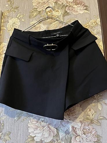 AMISU qadın şort - Model: yüksək bel, A-kəsim - Material: qara ekodəri (formanı saxlayan, yumşaq toxuma) - Ölçü: EU 36 (US/CAN göstərilib) - Dizayn detalları: - Geniş kəmər xətti və iri, mat tok...