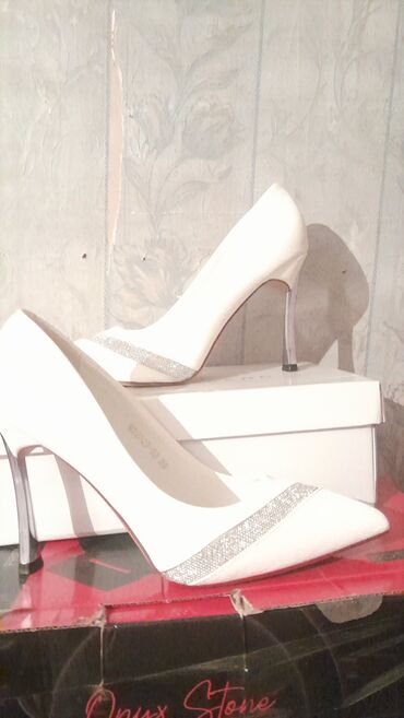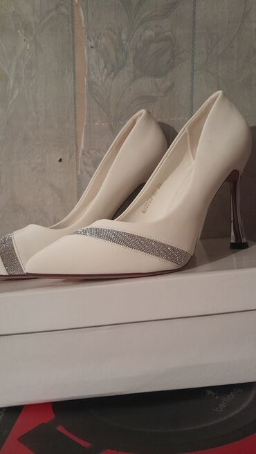 Ağ rəngli zərif qadın tuflisi - Dizayn: İti burunlu, klassik kəsim - Bəzək: Burun hissəsində gümüşü rəngli, xırda daşlı/zəncirvari parıltılı volant detallı aksesuar - Material: Parlaq lak effektli ...