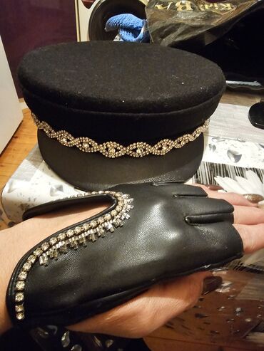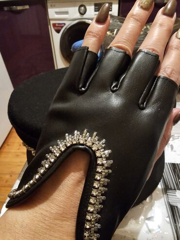 Qadın üçün qısa barmaqlı dəri əlcək - Rəng: qara - Material: yumşaq dəri (eko-dəri görünüşlü) - Dizayn: üst hissədə açıq kəsim və kəsimin ətrafında parlaq kristal/daş bəzəklər; ağız hissəsi də daş...