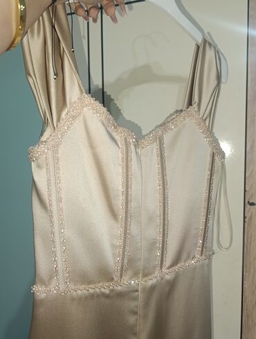 Zərif gecə/ziyafət donu 1 defe qeyinilib Əsil qiyməti 340 azn die - Rəng: açıq pudra/şampan. - Material: atlas parıltılı, yumşaq axan tekstura. - Dizayn: tək çiyin kəsimi (bir çiyindən keçir), üst...