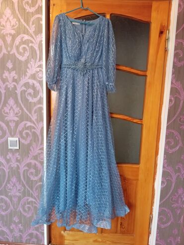 Məhsul: For Costume brendi, axşam/gecə geyimi - Rəng: Açıq mavi (pastel ton) - Model: Uzun, A-kəsim ətəkli, axıcı material - Ölçü: 40 (etiketdə göstərilib) - Üst hissə: Dərin V-yaxa, gümüşü parılt...