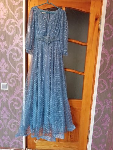 Məhsul: Zərif ziyafət/gecə geyimi – For Costume, ölçü 40 - Rəng: açıq mavi (pastel). - Model: uzun, axıcı ətəkli, beldən oturan kəsim. - Üst hissə: V-yaxa, ön hissədə gümüşü parıltılı naxışlar...
