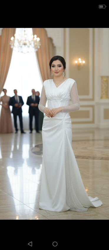 Ağ rəngli zərif ziyafət/gelinlik stili libas - Model: asimmetrik, bir tərəfi düşən şal/ətək paneli ilə drapeli dizayn - Parça: atlasa bənzər parıltılı, axıcı material - Üst hissə: yüngül büzmələr,...