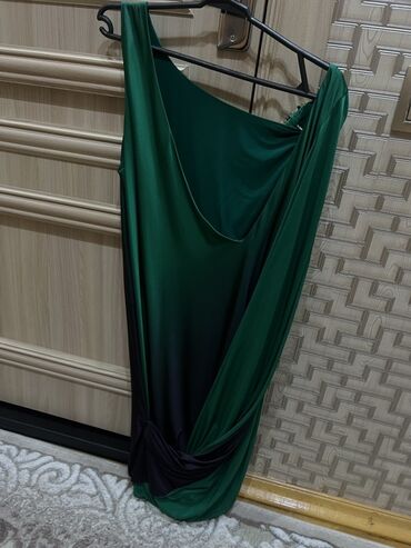 Zümrüd-yaşıl rəngdə zərif gecə/libas - Model: asimmetrik kəsimli, bir tərəfi qolsuz-keplinvari düşümlü, digər tərəfi uzun qollu - Parça: axıcı, yüngül və dalğalı tökülüşlü şifon tipli material - B...