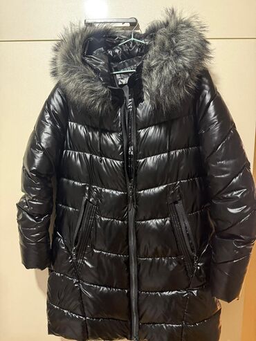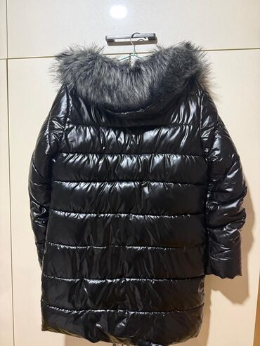 Qadın üçün qışlıq qara şişmə palto. - Material: parıltılı suya davamlı üst qat, isti doldurucu - Yaxası və əlcək hissəsi: süni/xəz effektli yumşaq xəz detalları (boğaza və qol uclarına) - Bağlanma...