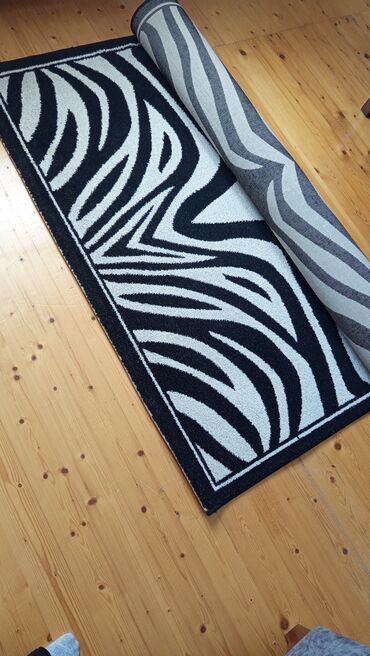 Zebra naxışlı qara-ağ rəngli xalça. Bu xalça zolaqlı dizaynı ilə evinizə müasir və dəbli görünüş qatır. Həm dekorativ, həm də praktik istifadə üçün uyğundur. Döşəməni qorumaq və isti saxlamaq üçün idealdır.(1.50 sm eni,2.30 uzunluğu)