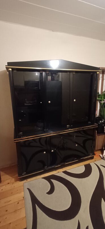 Qara vitrin/servant dolabı - Material: parlaq qara MDF/taxta kompozit - Dizayn: yuxarı hissə şüşəli sürgülü qapılarla, aşağı hissə qapalı dolab bölməsi; qızılı xətlər və dekorativ elementlər - Rən...Giriş•Qeydiyyat