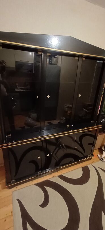 - Material: parlaq qara rəngli korpus, tünd şüşə sürgülü qapılar, dekorativ qızılı xəttlər və relyef naxışlar