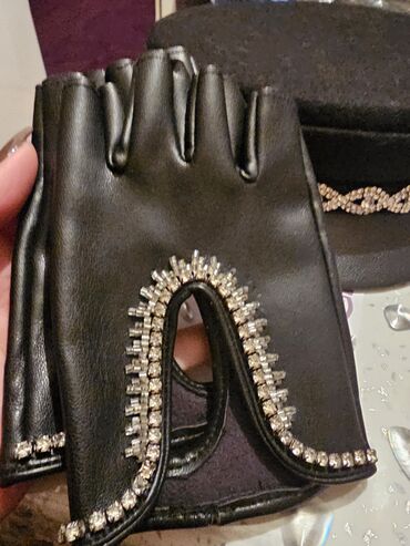 - Qısa barmaqlı əlcək: qara eko‑dəridən, üst hissədə açıq “U” kəsim. Kəsimin kənarı boyunca şəffaf/brilliant effektli rhinestonlar və silindrik şüşə bəzəklərlə işlənib. Bilək hissəsində də zərli lent davam edir. Yumşaq daxili, barmaq hissələri sərbəst hərəkət üçün açıqdır. Şou, səhnə çıxışı, rəqs və ya stilize gündəlik görünüş üçün idealdır.