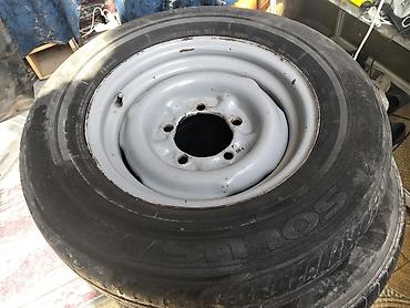 - Polad disklə birlikdə təkər komplekti. 5 bolt üçün mərkəz, kamerəsiz tip (tubeless), diskin rəngi boz, üzərində “SOLUS” yazılı şin.