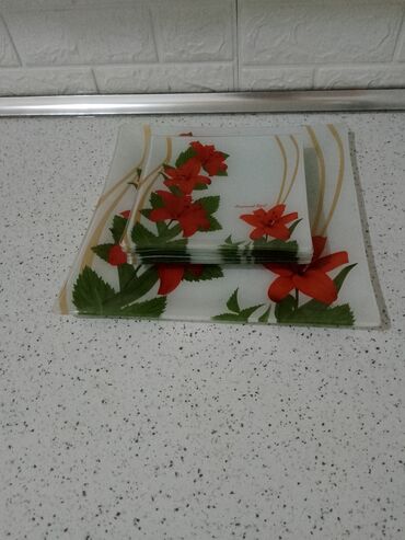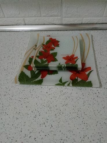 Kvadrat formalı şüşə boşqab dəsti - Material: temperli şüşə - Forma: kvadrat - Rəng/naxış: ağ fon üzərində qırmızı zambaq çiçəkləri və yaşıl yarpaqlar, qızılı zolaqlar - Komplekt: bir böyük kvadra...