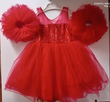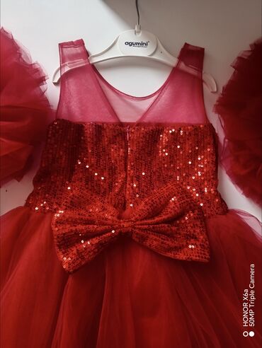 Qız uşağı üçün bayramlıq/qonaqlıq paltarı - Rəng: qırmızı (bordo tonlarında) - Üst hissə: parıltılı payetli material, qısa qol - Etek: çoxqatlı tül, dizdən aşağı uzunluq, yüngül və həcimli - Bel h...