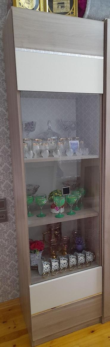 - 2 ədəd vitrin şkaf: şüşə qapılı, açıq rəng ağac teksturası və krem panellə kombinə. Raflar vitraj/servis qabları üçün genişdir. Üst və alt hissələrdə qapalı bölmələr var.
