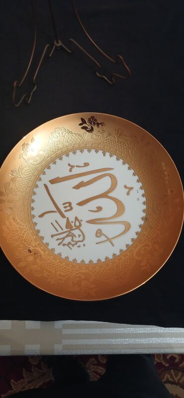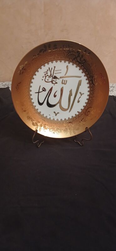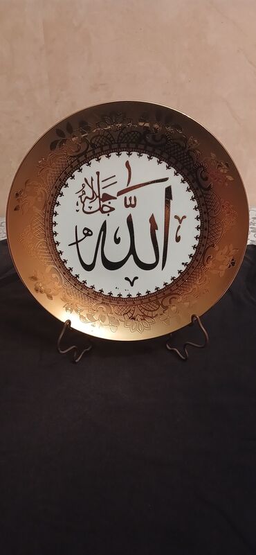 Digər janrƏrəb xəttatlığı ilə bəzədilmiş bu dekorativ boşqab qızılı və ağ rənglərin ahəngini təqdim edir. Boşqabın mərkəzində qızılı rəngdə Ərəb xəttatlığı, kənarlarında isə qızılı naxışlı haşiyə yer alır. Bu boşqab evinizə və ya ofisinizə zərif bir toxunuş qatmaq üçün idealdır. O, həmçinin xüsusi günlər üçün gözəl bir hədiyyə ola bilər. Boşqab bir metal stend üzərində təqdim olunur, bu da onu istənilən səthdə sabit şəkildə nümayiş etdirməyə imkan verir.