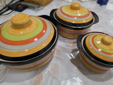 Gül naxışları ilə bəzədilmiş emaye bişirmə qazan dəsti. Dəstə üç müxtəlif ölçülü qazan daxildir, hər birinin öz qapağı var. Bu qazanlar müxtəlif növ yeməklərin hazırlanması üçün uyğundur.