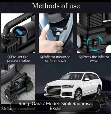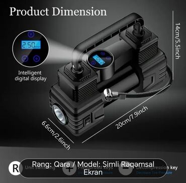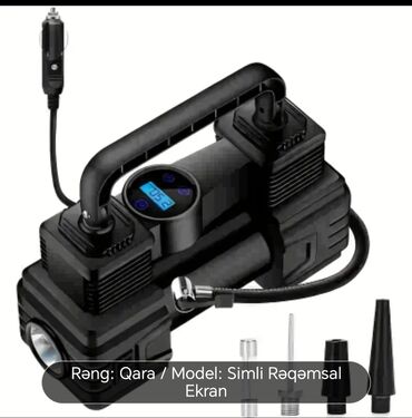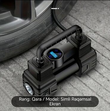 Qara rəngdə, rəqəmsal ekranlı, simli avtomobil təkərinin şişirdicisi. Təkər təzyiqini əvvəlcədən təyin etmək funksiyası var. Kompakt dizaynı sayəsində avtomobildə asanlıqla daşına bilər. Təkərləri tez və asanlıqla şişirmək üçün rahatdır. Avtomobil motosiklet velosiped və top doldurmaq üçün elektron hava nasosu.