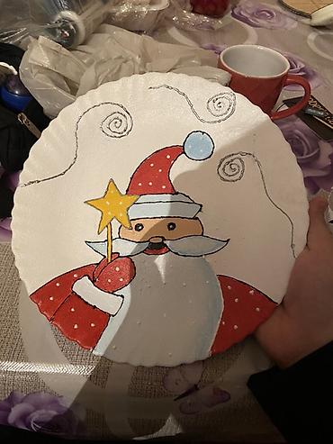 - Dekorativ əl işi boşqab: Yeni il üslubunda, qırmızı-ağ geyimli şən obraz, ulduz formalı çubuqla. Masa üstü və ya divar dekoru kimi istifadə oluna bilər.