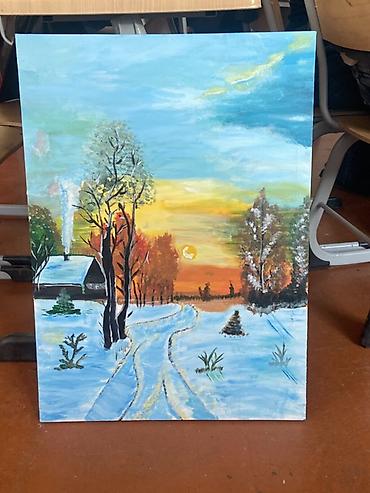 Əl işi yağlı boya tablolar toplusu Təsvir: - Kətan üzərində yağlı boya ilə işlənmiş orijinal rəsm əsərləri. - Mövzular: qış mənzərəsində qürub (çayın kənarı, qayıq, meşəlik və işıqlı kulba), canlı...