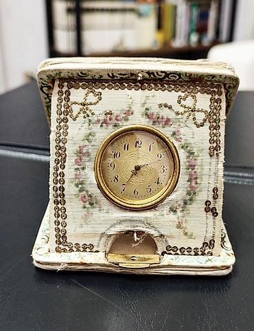 Ölçü təxmini: Kiçik formatlı səyahət saatı (ovuc içi ölçüsü). Mexaniki quruluşlu klassik masa/səyahət saatı üslubu.