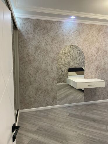 - Döşəmə: bütün mənzildə vahid, açıq-boz tonlu taxta fakturalı laminat