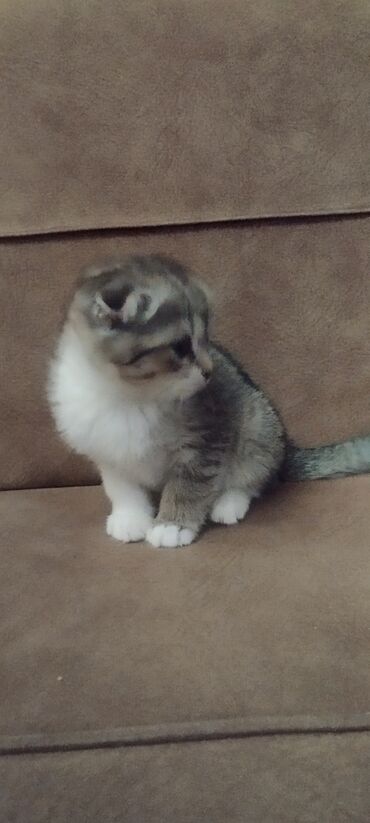 Skottish Fold balası – ev pişiyi - Cins: Scottish Fold (qatlanmış qulaqlar) - Rəng: boz-ağ tabby (zolaqlı), sinə və pəncələr qar-bəyaz - Yaş kateqoriyası: balaca - Xüsusiyyətlər: yumşaq, sıx tüklü...