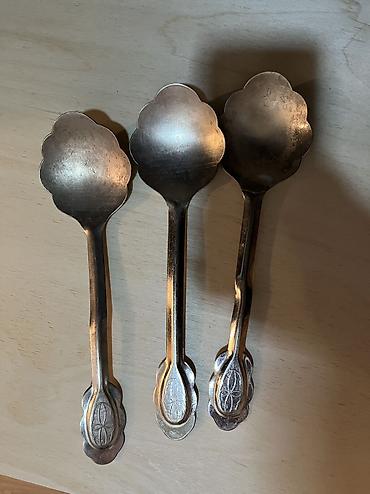Kolleksiya üçün köhnə metal qaşıqlar dəsti - Müxtəlif ölçülərdə bir neçə dəst: - 6 ədəd orta ölçülü süfrə qaşığı – saplarında klassik barokko naxışları - 7 ədəd iri ölçülü süfrə qaşığı – eyni...