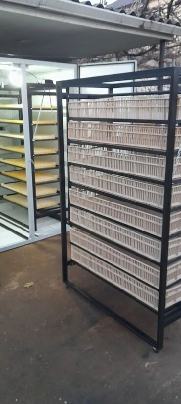 - Ayrı böyük çıxım (hatcher) rəfi: möhkəm metal çərçivə, çoxsaylı qatlar, hər qatda havalanmanı təmin edən plastik səbətlər; təkər üzərində rahat daşınma.